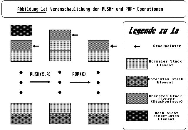 - Mit POP, schließlich, kann solange das oberste Element des Stacks gelöscht werden, wie noch Elemente vorhanden sind. Am Schluß muß die Rückgabe eines jeden Elementes an das Betriebssystem, mittels DISPOSE, erfolgen. Werden nicht vorhandene Stackelemente gelöscht, so ruft dies keinen Fehler hervor, sondern erzielt lediglich keine Wirkung.