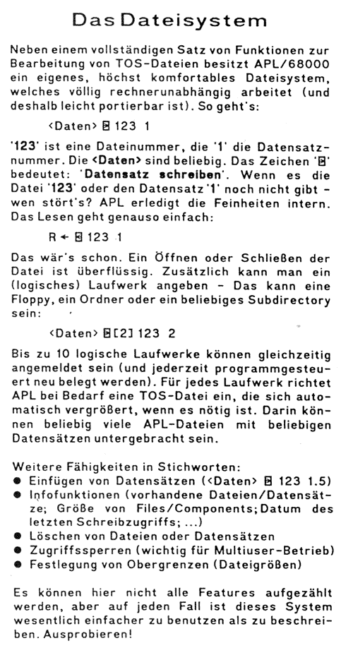 Aber der Reihe nach: Das Dateisystem des APL/68000 ist hervorragend. So einfach habe ich noch nie mit meinen Daten umspringen können (siehe Kasten). In Kombination mit den APL-KĂŒnsten bezĂŒglich der Listenverarbeitung ist selbst bei komplexen Anwendungen ein separates Datenbankpaket nicht mehr nötig. Meine Datenbank heiĂt APL.