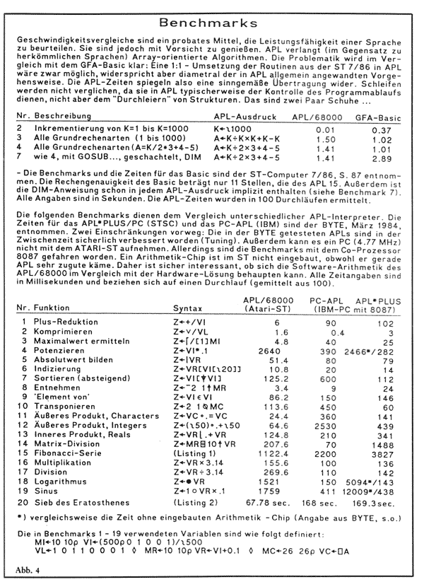 Die Benchmarks bestĂ€tigen diesen Eindruck. Nicht nur, daĂ APL (unter BerĂŒcksichtigung der höheren Rechengenauigkeit) mit dem GFA-Basic mithalten kann. Ein solcher Vergleich hinkt immer, wenn man an die vielen Sprachelemente denkt, die in keiner anderen Sprache eingebaut sind. Nein, der wirkliche Hammer ist, daĂ es APL auf dem ST mit einer reinen Softwarelösung mit dem Arithmetik-Prozessor des PC aufnehmen kann. Das zeugt von sorgfĂ€ltiger Codierung. Nur bei der Potenz-Funktion muĂ jemand bei Micro APL einen schlechten Tag gehabt haben.
