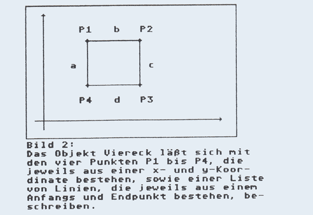 Das einfachste aller Objekte ist mit Sicherheit der Punkt. Um einen Punkt zu beschreiben, verwendet man ein Koordinatensystem (Bild 1). Die Koordinaten eines Punktes beschreiben seine Lage in bezug auf einen Ausgangspunkt, den Koordinatenursprung. Kompliziertere Objekte beschreibt man im einfachsten Fall als eine Menge von miteinander durch Linien verbundenen Punkten (Bild 2).