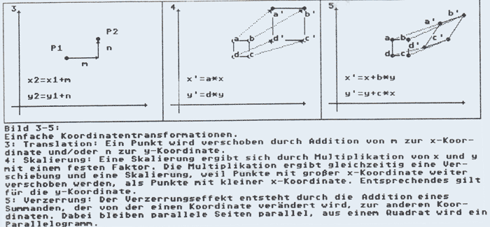In den Bildern 3-6 sehen Sie einige Möglichkeiten, mit denen man Punkte oder Objekte aus Punkten und Linien im Koordinatensystem manipulieren kann. Es läßt sich leicht nachweisen, daß es völlig genügt, die Endpunkte einer Linie zu manipulieren, um damit die ganze Linie analog mitzuverändern. Es ist also nicht nötig, alle Punkte einer Linie zu bearbeiten. In einer realen Welt wäre es auch unmöglich, besteht doch eine Linie aus unendlich vielen Punkten.