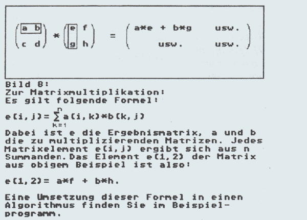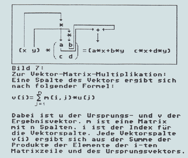 Zur Erklärung der Multiplikation einer Matrix mit einem Vektor betrachten Sie bitte Bild 7. Das wirklich praktische an einer Matrix ist aber, daß man sie nicht nur mit Vektoren, sondern auch mit anderen Matrizen multiplizieren kann (Bild 8). Wollen Sie also verschiedene Transformationen kombinieren, brauchen Sie nur die entsprechenden. Matrizen zu basteln (indem Sie für eine Skalierung z. B. die entsprechenden Werte für a und d ein-setzen). Für eine einfache Transformation ist das ganz einfach. Um jetzt alle gewünschten Transformationen auf einmal durchzuführen, brauchen Sie nur die Matrizen zu multiplizieren und dann ihre Punkte der Reihe nach mit dem Ergebnis zu multiplizieren. Einfach, nicht?