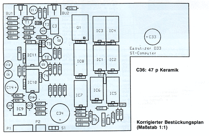 - Auf dem Bestückungsplan sind zwei Polaritätsangaben verrutscht: Bei C2 muß der Pluspol oben liegen. Bei C15 muß der Pluspol unten liegen.
