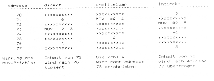 Das Argument verweist - nach Art der direkten Adressierung - auf eine andere Speicherstelle. Der Inhalt dieser Speicherstelle wiederum kann nun als direkte Adresse aufgefaßt werden, d. h. es wird um den Betrag der dort stehenden Zahl weiter gezählt, um die durch das Indirekt-Argument bestimmte Speicherstelle zu erhalten.