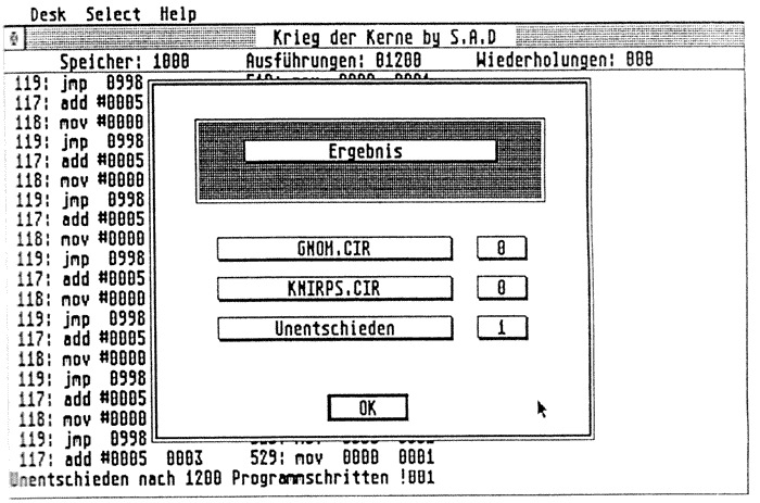 Das von uns erstellte Programm übernimmt die Übersetzung der mit einem Editor geschriebenen Programme, läßt sie gegeneinander kämpfen und zeigt das Ergebnis an. Es handelt sich um ein GEM-Programm; seine Drop-Down-Menüs ermöglichen die Einstellung einiger Parameter und Optionen. Auf der Public-Domain-Diskette befindet sich der „Krieg der Kerne“ sowie die Bedienungsanleitung zum Programm.