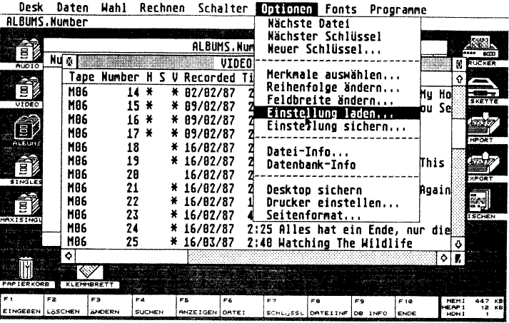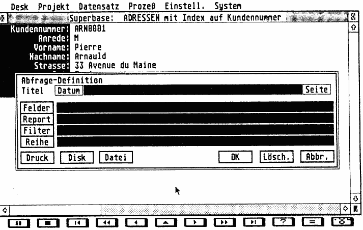 Von Precision Software kommt der vierte Vertreter der Datenbanken. Das wie Adimens oder dBase schon etwas ältere Programm (alt heißt nicht schlecht!) wurde an den Atari ST angepaßt. Es ähnelt in seiner Anpassung sehr stark der ebenfalls erhältlichen Amiga-Version (Bild 8). Unter dem Fenster befinden sich Tasten, die an ein Bandgerät erinnern. Hiermit kann man entsprechend einem Schlüsselfeld vor/zurückspulen, stoppen und Filterfunktionen aufrufen. Mit dem Filter kann die Anzeige der Datensätze an bestimmte Bedingungen geknüpft werden. Dabei lassen sich die Kriterien in verschiedenen Formularen durch einfaches Anklicken auswählen.