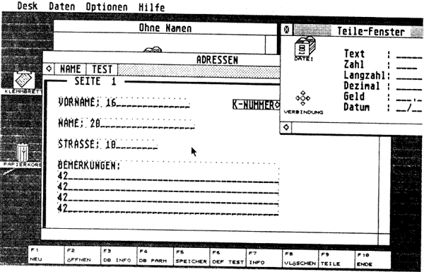Insgesamt macht ADIMENS einen hervorragenden Eindruck, der in erster Linie auch durch die durchdachte GEM-Oberfläche zustandekommt (Bild 5). Das Programm bietet auch ohne Programmierung Flexibilität und einfachste Bedienung, wie sie andere Systeme selbst mit aufwendigen Programmen nicht erreichen. Mittlerweile gibt es für Adimens auch fertige Datenbanken zu kaufen. Dann braucht man sich nicht einmal mehr um den Aufbau (die Dateien und ihre Verknüpfung) Gedanken machen.