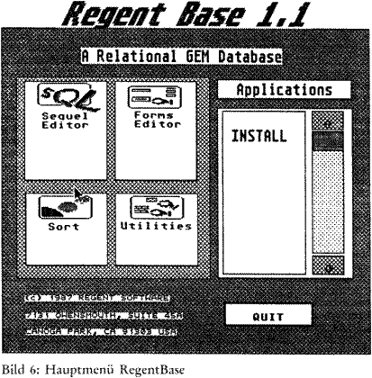 In Deutschland ist die amerikanische Firma Regent Software leider noch nicht sehr bekannt, dies allerdings zu unrecht. Regentbase besteht aus 5 Teilprogrammen, die durch ein Menüprogramm (Bild 6) aufgerufen werden. Nach der Erstellung einer Datenbank hält man sich im allgemeinen nur noch im Programm BASE.PRG auf. Dieses Programmodul führt selbstgeschriebene Regent Base-Programme aus. Doch soweit ist es noch nicht. Angenommen, man möchte keines der mitgelieferten Beispielprogramme benutzen, so muß zuerst eine Datenbank angelegt werden. Eine Datenbank kann z. B. mit einem mitgelieferten Utility-Programm definiert werden. Die Utility unterstützt die Mausbenutzung, so daß die Definition sehr schnell vorzunehmen ist. Hat man sich eine solche Datei geschaffen, so kann sie aus dem Hauptprogramm BASE bearbeitet werden. Hierfür dient die Sprache SQL, doch dazu später mehr.