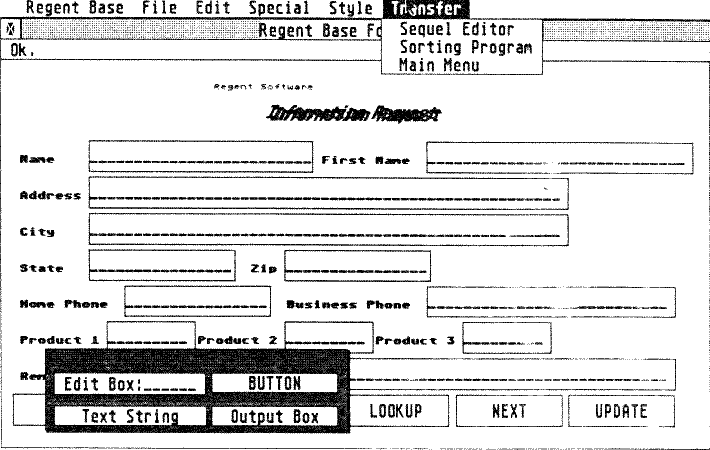 Zunächst gibt es da noch eine andere Möglichkeit: Man erstellt mit dem mitgelieferten Editor (Bild 7) ein Programm, daß eine Datenbank anlegt und die Pflege der Daten ermöglicht. Man kann komfortabel eine Eingabemaske generieren, die dann der Endbenutzer verwendet. Hierfür bietet RegentBase auch Buttons an, so daß die erstellte Eingabemaske später auch mit der Maus bedient werden kann. Hat man diese Maske erstellt, so kann man sich zu jedem Feld eine Kennummer angeben lassen und im eigenen Programm leicht über diese Kennummer auf die eingegebenen Daten zugreifen. Wenn man im Programm schreibt %Kennummer, so wird hier automatisch mit dem gerade aktuellen Inhalt des Feldes gearbeitet. Über die Funktion USERS kann das eigene Programm auch Mausklicks entgegennehmen.