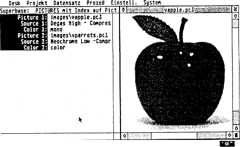 ...lassen sich mit Superbase verwalten. Es ist das einzige Programm, daß in der Lage ist, innerhalb einer Datenbank einen Bezug zu einer externen Datei, wie z. B. Bildern (Bild 9) herzustellen. So könnten Sie zum Beispiel zu allen Geschäftsfreunden digitalisierte Bilder speichern. Oder Sie speichern zu einem Angebot die entsprechende Konstruktionsskizze.
