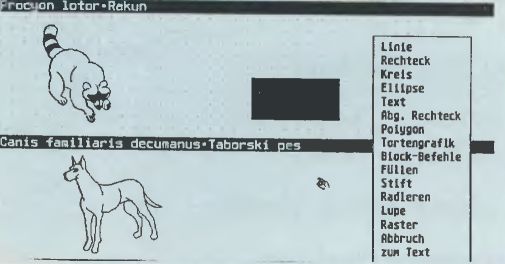 Kommen wir nun zur Graphikausstattung von Steve. Das Programm unterscheidet reine Text- und reine Graphikzeilen, wobei letztere durch Betätigung der Escape-Taste erzeugt werden. Im erweiterten Graphikmodus stehen nahezu alle Befehle zur Verfügung, die man auch von Degas kennt. Linien, Rechtecke, Kreise, Ellipsen, Polygone, Tortengraphiken, Blockverschiebungen, Hilfsraster, Zeichenstift und Füllmuster wären etwa zu benennen. Bei allen Funktionen gibt es überdies noch zahlreiche Unterpunkte. So kann man zum Beispiel zwischen 10 Liniendicken mit oder ohne Pfeilende auswählen, oder bei den Fülloperationen unter 36 Mustern das Gewünschte anwählen. Die Blockkommandos sind großzügig ausgefallen, selbst das Invertieren oder Vergrößern eines markierten Bereichs stellt keine Schwierigkeiten dar. Nicht jedes Programm bietet ein unterlegbares Raster zum exakten Zeichnen oder aber Koordinatenangaben zum präzisen Bemaßen, — wohl aber Steve.