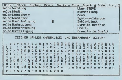 Neben diesen obligaten Editorfähigkeiten, bietet Steve einige Schmankerl, die eher exotisch anmuten. Dazu gehört zum Beispiel das Vertauschen von Kleinbuchstaben in Großbuchstaben und umgekehrt. Oder der Wechsel der Schreibrichtung von rechts nach links für arabische Texte. Dazu bedarf es natürlich eines zusätzlichen Zeichensatzes, den man, wie bei Signum, selbst erstellen und verändern kann. Schließlich bietet Steve schon von Hause aus 9 Schrifttypen für den Bildschirm: von 40 bis sage und schreibe 160 Zeichen pro Zeile. Schwierig wird es erst bei der Druckerausgabe. Die unterschiedlichen Zeichenbreiten auf dem Schirm ändern an der gedruckten Fassung nichts. Sie dienen nur dazu, eventuell auch bei größeren Tabellen den Überblick zu behalten. Zeilenlineale, wie bei Wordplus, für den Wechsel der Schriftbreite innerhalb eines Dokuments, kennt Steve nämlich (noch) nicht. Allerdings können die Sonderzeichensätze (wie der mitgelieferte kyrillischen Font in den Bildern 2 und 3) auch ausgedruckt werden. Dazu muß man allerdings jedes einzelne Zeichen in eine „Download-Tabelle“ für den Drucker packen.