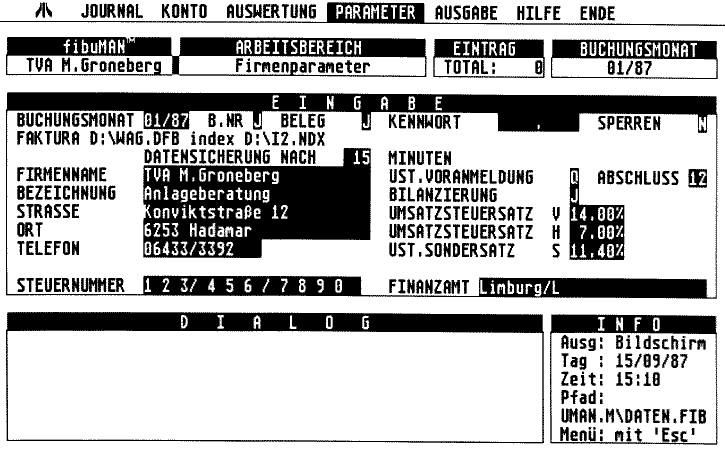 Keine Vorteile ohne Nachteile: Da es noch keinen Compiler für dbMAN gibt, muß immer zuerst die Run-Time-Version von dbMAN, auf der Diskette FiBUMAN genannt, geladen werden. Sofern man die optimale Konfiguration (1 MB und Hard Disk) hat, kein Problem, nicht einmal ein zeitliches. Bei einer Version mit 520 KB Speicher jedoch eher, da FIBUMAN allein schon 206 KB verbraucht. Dennoch ist das Programm auch hier lauffähig. Sobald der Compiler vorliegt, wird fibuMAN in der compilierten Version als Update angeboten.