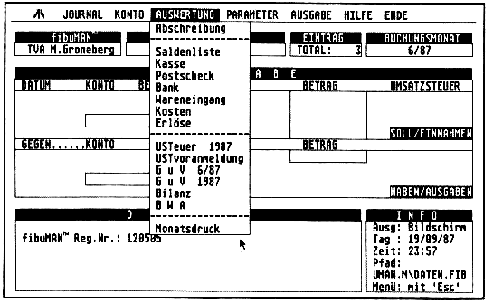 Das Menü AUSWERTUNG, das Prunkstück von fibuMAN wird später aufgeführt.