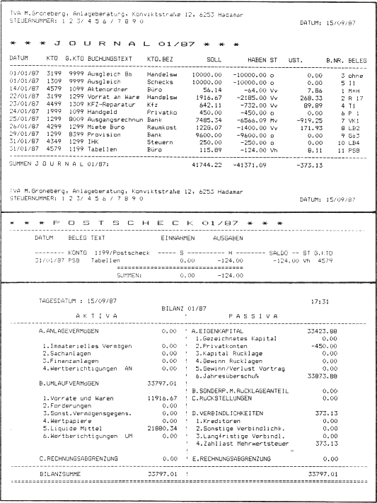 Alle oben angeführten Auswertungsmöglichkeiten können auch einzeln abgerufen werden (Beispiele siehe Kopien: 1. Journal, 2. Postscheck, 3. Bilanz,) und zwar nicht nur am Ende bestimmter Perioden sondern stets dann, wenn man es wünscht, bzw. diese Übersicht benötigt. Eine bessere und schnellere Grundlage für eine ständige Übersicht über die Finanzlage und die Betriebskennzahlen einer Firma ist kaum vorstellbar.