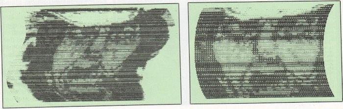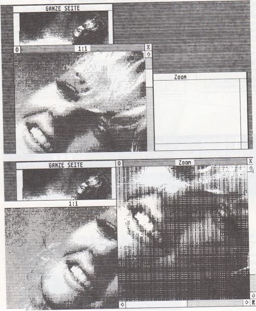Das in dem Rechner eingelesene Bild wird in zwei getrennten Fenstern dargestellt. In einem kann man das gesamte Bild, das zuletzt 'gescannt’ wurde, als Vollbild sehen, in dem anderen wird nur ein Teil, der sich beliebig in jeder Richtung verschieben läßt, davon dargestellt. Ein drittes Fenster wird bei der Zoom-Funktion gebraucht.