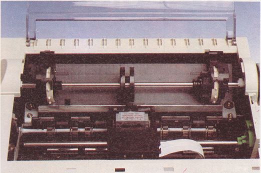 Dieser Drucker ĂŒberrascht mit einem etwas eigenwilligem Design. Das GerĂ€t besitzt einen halbautomatischen Einzelblatteinzug von vorne, der mit einer Klappe verschlossen wird. Ebenfalls serienmĂ€Ăig integriert ist ein Traktor, diesen kann man wahlweise als Schub- oder Zugtraktor verwenden. Wenn man zwischendurch einmal ein Einzelblatt bedrucken möchte, braucht man nicht mehr das Papier aus dem Traktor zu entfernen. Man âparktâ das Endlospapier in dem Traktor, (diese Funktion wird ĂŒber eine Tastenkombination angewĂ€hlt) und koppelt den Traktor ĂŒber ein Stellrad an der Oberseite des Druckers aus. Danach öffnet man die Klappe an der Front des GerĂ€tes und legt das Papier an. Ein Druck auf die Taste âFEEDâ und das Einzelblatt wird eingezogen. Jetzt kann es mit dem Drucken losgehen. Umgedreht verfĂ€hrt man dann, wenn man wieder Endlospapier verarbeiten möchte. Einzig das EinfĂ€deln des Papiers bei Schubbetrieb kann fĂŒr den ungeĂŒbten Anwender zu leichten Problemen fĂŒhren. Es kann aber fĂŒr nur 230,- DM ein vollautomatischer Einzelblatteinzug gekauft werden, mit dieser Option ist dann Textverarbeitung pur möglich. Der Schacht faĂt bis zu 50 EinzelblĂ€tter, die dann vollautomatisch eingezogen werden. Beim Betrieb des Schachtes muĂ man nur darauf achten, vorher auch im Soft-MenĂŒ ihn zu konfigurieren.