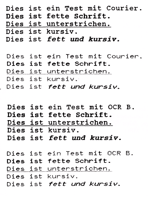 Auch bei dem NEC P2200 haben wir wieder die gewohnte QualitĂ€t der Schrift wie auch bei den schon bekannten P6/7. Allerdings fiel bei dem getesteten P2200 leider das Farbband etwas aus der Rolle. Die Matrix war leider etwas deutlich zu sehen, was auf ein sehr schlecht getrĂ€nktes Farbband zurĂŒckzufĂŒhren war. Hier verspricht NEC Deutschland aber schnellste Abhilfe. Bild 1 zeigt verschiedene Schriftmöglichkeiten, die der P2200 anbietet. Interessant erscheint uns vor allen, daĂ der P2200 bereits ab Werk drei (3) Schriftarten mehr hat, als sein groĂer Bruder, der P6. Sonst aber verhĂ€lt sich der P2200 genau wie der P6.