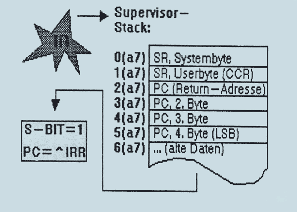 Nach diesem nicht allzu ernst gemeinten Trip in die Welt der Betriebs-Software nun zum Trap, denn wir wollen ja wissen, wie diese Vorgänge realisiert werden. Eine der größten Stärken der MC68000, so steht es geschrieben, sei ihre Fähigkeit, Interrupts zu verwalten. In der Tat stehen dem System 256 Vektoren zur Verfügung, die in Ausnahmefällen dem Rechner und dem BS das 'Leben' retten können! Im allgemeinen laufen Anwenderprogramme im sog. User-(U-) Mode. Hier sind einige der Maschinenbefehle nicht erlaubt und auch innerhalb des Speichers gibt es 'Sperrbezirke’, die für Programme tabu sind. Diese Maßnahmen sollen dazu dienen, das BS gegen unbefugten Zugriff und damit gegen 'Absturz' zu schützen. Im MOTOROLA-Jargon ist alles, was die CPU in den Supervisor-Modus (S-Mode) versetzt, eine Ausnahme (engl.: exception). Das soll nicht etwa darauf hinweisen, daß so etwas selten vorkäme, sondern darauf, daß irgendjemand irgendetwas vom BS erwartet, oder daß irgendwo irgendetwas irgendwie schief gegangen ist. Genaugenommen muß man also, zwischen zwei verschiedenen Exceptions unterscheiden: Den Traps, die prinzipiell von der Software explizit durch Befehle oder aber durch Laufzeitfehler (Division durch Null etc.) ausgelöst werden, und den Interrupts, die ausschließlich von der Hardware erzeugt werden. Im ST ist das bekanntermaßen so gelöst, daß der Anwender mittels TRAP-Befehl die Funktionen des TOS anfordern kann, während er normalerweise mit Interrupts (IR) überhaupt nichts zu tun hat. Diese Arbeit übernimmt glücklicherweise allein das BS.
