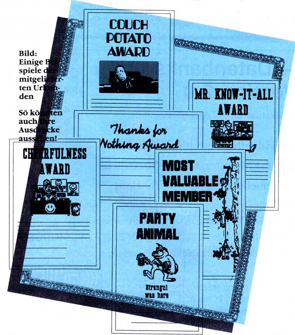 Der Wermutstropfen an diesem von der Idee und Grafik her sehr schönen Programm, ist seine nicht gerade übermäßige Schnelligkeit. Obwohl es schon um einiges besser als PRINTMASTER programmiert worden ist, merkt man doch, daß es sich um eine Anpassung an den ST handelt. So sind auch eine große Anzahl von Druckertreibern vorhanden, aber vergeblich sucht man Druckertypen wie NEC P6, also 24-Nadel-Drucker, oder etwa STAR NL 10, der aber nach einigem Ausprobieren mit einer anderen Druckeranpassung 'zum Laufen' gebracht wurde. Leider wird die Urkunde nach jeder Eingabe neu aufgebaut, was doch eine kleinen Moment dauert und bei vielen Änderungen verärgern könnte - einige Routinen, in Maschinensprache geschrieben, könnten nicht stören. Leider gibt es auch keine Möglichkeit das Bild zeichnerisch nachzubearbeiten, geschweige denn eigene Ideen zu verwirklichen. Glücklicherweise gibt es eine käufliche zu erwerbende-Zusatzdisk, auf der über hundert neue Urkunden und 24 neue Ränder zu finden sind; man darf hoffen, daß diese nicht zu teuer sein wird.
