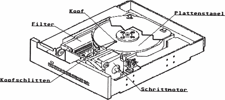 Zuvor möchte ich aber noch einmal kurz auf den ersten Teil dieser Folge eingehen. Die Zeichnung am Anfang des Artikels “sollte' das Laufwerk TM-755 von Tandon darstellen, das gleiche Laufwerk habe ich auch für meinen Umbau verwendet. Es weist eine Bruttokapazität (d.h. unformatiert) von 51 MByte auf, besitzt drei 5 1/4"-Platten und 5 (!) Köpfe. In der obigen Zeichnung ist diesmal das Laufwerk TM-262 (ebenfalls von Tandon) dargestellt. Dieses Festplattenlaufwerk hat in der SH-204 das ST-225-Laufwerk von Seagate abgelöst und wird jetzt auch in der SH-205 verwendet. Es besitzt eine Bruttokapazität von 25 MByte, diese wird mit zwei 3,5"-Platten und vier Köpfen erreicht. Im Unterschied zum TM-755 wird zur Kopfpositionierung ein Schrittmotor verwendet.