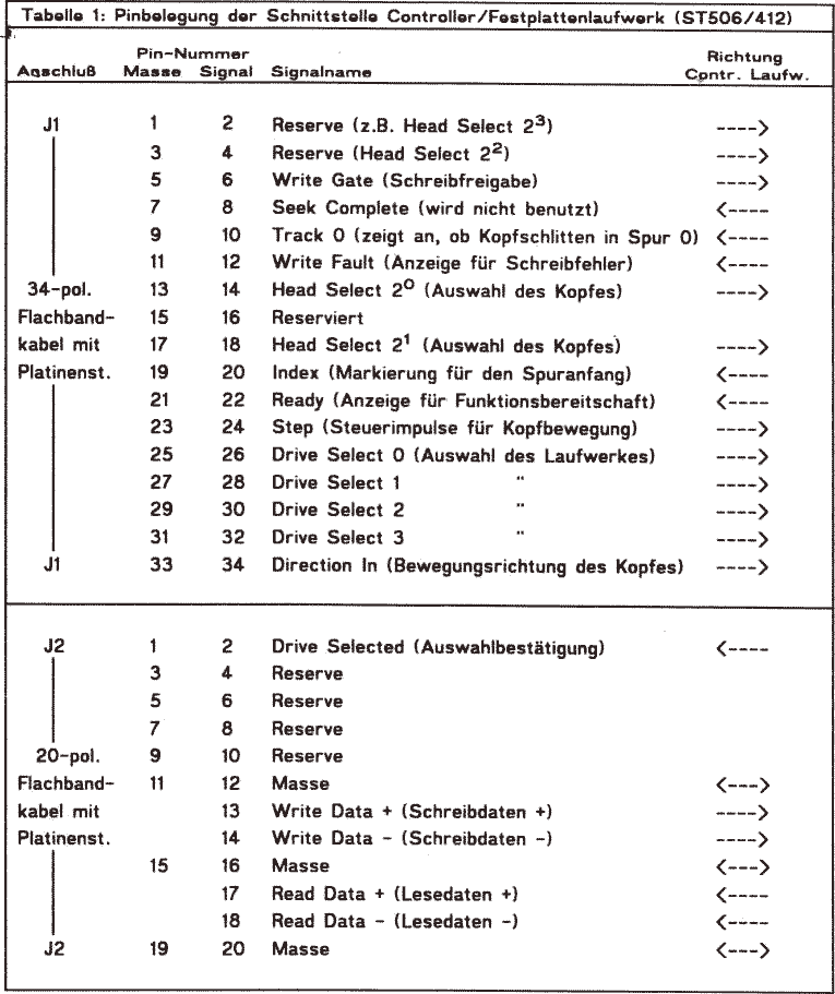 Im großen und ganzen entspricht von der Art der verwendeten Signale die ST-506-Schnittstelle der eines Floppylaufwerkes, wenn auch die Belegung eine andere ist. Auffallend ist die große Zahl von Head-Select-Leitungen. Wie ich Ihnen im ersten Teil der Serie schon gezeigt hatte, gibt es heute Festplattenlaufwerke mit mehr als acht Platten. Pro Platte wollen zwei Köpfe adrdressiert sein, und dies geschieht leitungssparend über Head-Select. Die Anwahl des Kopfes für das TM-262-Laufwerk finden Sie als Beispiel in der nebenstehenden Tabelle. Die Aufgaben der anderen Kontrolleitungen sind im nebenstehenden Kasten kurz erklärt.