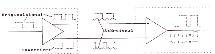 Das obige Schaubild soll erklären, worum es bei der ganzen Sache geht. Im linken Teil des Bildes entsteht ein Signal, welches über ein Verbindungskabel an den rechts zu erkennenden Empfänger geschickt werden soll. Bei sehr kleinem Signalpegel besteht die große Gefahr einer Störeinstreuung, wie sie durch hochfrequente Sender (z.B. Taktquarz im Computer !) oder durch Brummeinstreuungen (z.B. Netzteil) entstehen können. Um diese so weit wie möglich zu eliminieren, bedient man sich der symmetrischen LeitungsfUhrung. Dazu wird vom Signalgeber das Signal auf einer Leitung im Original, auf einer zweiten Leitung aber invertiert, d.h. gegenphasig, abgeschickt. Eine von außen kommende Störspannung trifft jetzt auf beide Leitungen gleichzeitig und überlagert sich auf das Originalsignal und das invertierte Signal. Im Empfänger wird jetzt eine Leitung im Original übernommen, die zweite Leitung aber wieder invertiert. Zweimalige Invertierung ergibt aber logischerweise wieder das Originalsignal. Damit steht jetzt zweimal das Original in gleicher Phase zur Verfügung, das Störsignal einmal original und einmal invertiert. Jetzt brauchen beide Signale nur addiert zu werden, dann ist das Original sogar verstärkt (!) vorhanden, während sich die Störspannung gegenseitig auslöscht. Und das war ja der Sinn des Ganzen...