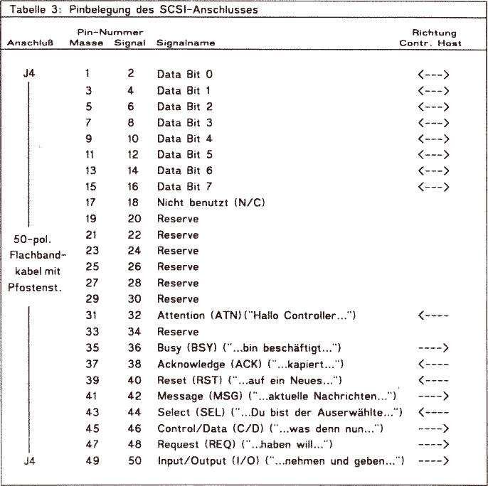Der SCSI-Bus (Small Computer System Interface) ist eine bidirektionale, parallele Schnittstelle, über die bis zu acht “intelligente” Peripheriegeräte miteinander kommunizieren können. Intelligent deswegen, weil die Abwicklung des Datenaustauschs sowohl vom Sender als auch vom Empfänger aktiv gesteuert wird. Dazu besitzt das Peripheriegerät - wie in unserem Fall - entweder einen eigenen Mikroprozessor oder aber einen speziellen SCSI-Controlchip. Die Schnittstellen werden in der Regel über ein 50-pol. Flachbandkabel verbunden. Die Belegung finden Sie in Tabelle 3 auf gelistet, die Bedeutung der Signalleitungen ist im folgenden Kasten kurz erläutert.