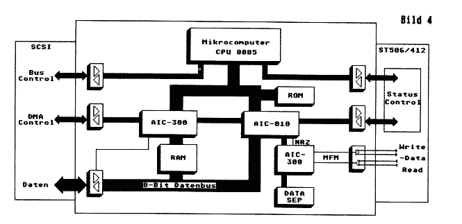 Der Controller ACB-4000 ist auf einer 197 x; 146 mm großen Platine untergebracht. Im nebenstehenden Blockschaltbild erkennen Sie den prinzipiellen Aufbau (Wer sich für die kompletten Schaltungsunterlagen zur SH-204 oder SH-205 interessiert, kann diese beim Schaltungsdienst Lange in Berlin. Tel. 030/7036060, beziehen; das Ser-tice-Manual mit Schaltplänen des Controllers. des Hostadapters und des Netzteiles »wie Bestückungsplänen und -listen kostet iir die SH-204 bei Vorkasse DM 30,-, sonst zuzüglich Versand- und Nachnahmekos-en. dort sind auch fast alle anderen Schalt-mgsunterlagen zu ATARl-Geräten zu bekommen). Links in dem Bild sehen Sie die SCSI-Schnittstelle, auf derrechten Seite die Anschlüsse für die Festplatte. Dazwischen passiert jetzt einiges. Unser Computer schickt ja “einfach” die Daten an den DMA-Fort und erwartet, daß die Festplatte sie verarbeitet. Diese Aufgabe übernimmt, wie weiter oben schon gesehen, der Controller. Er muß