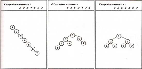 Wie Sie in Abbildung 5a leicht erkennen, sieht, in AbhĂ€ngigkeit von der Eingabereihenfolge, das Aussehen der resultierenden BĂ€ume sehr unterschiedlich aus. Bei der linken Eingabesequenz sehen Sie, daĂ der Baum zu einer linearen Liste wird. Dabei geht der groĂe Vorteil der SuchbĂ€ume, die kurzen Suchwege, verloren. Deshalb nennt man diesen Baum und andere BĂ€ume, denen man die Baumstruktur nicht mehr ansehen kann, degenerierte BĂ€ume.
