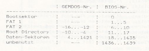 Um die Sache noch ein wenig zu komplizieren, zÀhlt GEMDOS die Sektoren intern nicht wie das BIOS, sondern hat seine eigene ZÀhlweise, in der die eben besprochene Strukturierung des Mediums zum Ausdruck kommt.