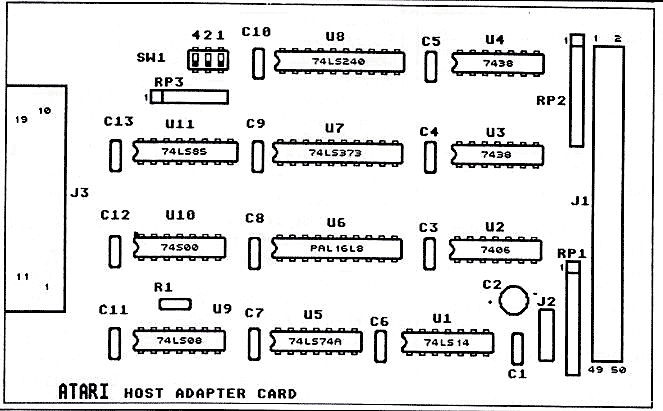 Bei der nachfolgenden Beschreibung des Hostadapters beziehe ich mich auf die SH-204, da er hier noch separat aufgebaut ist. In der SH-205 fehlen die Puffer-ICs zwischen Adapter und Controller, außerdem wurde er um einen gepufferten DMA(ACSI)-Port erweitert.