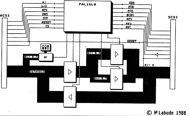 Beim Betrachten der ACSI-Anschlußbuchse und der Signale des SCSI-Bus sind Ihnen bestimmt die verschiedenen Steuerleitungen aufgefallen. Durch einen zeitlich genau festgelegten Ablauf der Signale über diese Anschlüsse kann das Target ein Kommando vom Daten- oder Statussignal unterscheiden. Nur sind die Signalleitungen von ACSI und SCSI nicht identisch. Die notwendige Konvertierung übernimmt der Hostadapter. Er setzt also die Signale vom ACSI über Logikschaltungen (in der Hauptsache im PAL) in die notwendigen Steuersignale für das SCSI um. Das Prinzip der Steuerung über Command-/Data- und Status-Phase wird dabei nicht verändert!