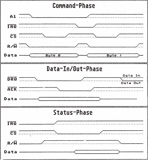 Die Zeitdiagramme der einzelnen Phasen sind im nebenstehenden Bild zu sehen. Wenn man sich beim Betrachten der Diagramme noch die Geschwindigkeiten für die Datenübermittlung über den ACSI-Bus in Erinnerung ruft, wird klar, warum ATARI das Anschlußkabel zur Festplatte so kurz gehalten hat. Jede kleinste Verzögerung durch ein überlagertes Störsignal würde ja den ganzen Busfahrplan durcheinander bringen (ein paar Dezimeter mehr sind trotzdem noch drin; davon in der nächsten Folge mehr).