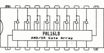 Daraus erfolgte die Entwicklung der PALs. Es handelt in erster Linie auch um programmierbare Matrixbausteine, wobei aber im Unterschied zum PROM bereits die logische Funktion programmiert wird. Außerdem kann in der Regel ein Teil der Anschlüsse eines PALs als Ein- oder Ausgang programmiert werden, und es ist zusätzlich eine Rückführung eines Ausgangs in das PAL möglich (Wird ein solcher Ausgang durch die gerade anliegenden Signale ausgeschaltet und damit hochohmig, kann dieser Port als Eingang benutzt werden!). Damit läßt sich aber auch ein solcher Baustein kaum noch kopieren, da man die Funktion als Ein- oder Ausgang nicht mehr erkennen kann. Zusätzlich gibt es eine sogenannte Last-Fuse, nach deren Brennen ein Auslesen verhindert wird (es werden willkürliche Ausgangsmuster erzeugt). Einen besseren Kopierschutz kann man sich wohl kaum vorstellen. Das Anschlußbild des im Hostadapter verwendeten PALs habe ich Ihnen untenstehend aufgezeichnet.