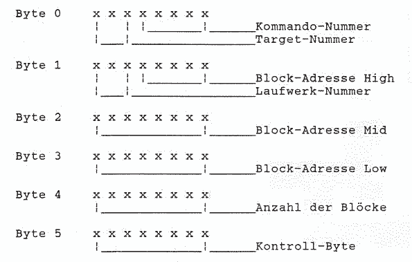 Das darunterliegende IC vergleicht die eingestellte Nummer mit der auf dem Datenbus (Bit 5 bis 7) anliegenden. Sind diese identisch, so meldet das PAL es über die Interrupt-Leitung (INT) zurück und der Hostadapter bleibt auf Empfang. Im anderen Fall ignoriert er ganz einfach die folgenden Daten. Um den Bus durch eine Schlafmütze nicht zu blockieren, läßt der ATARI den Targets max. 100 ms Zeit (so schnell sind Sie nicht am “Türdrücker”...), ansonsten veranlaßt er einen Time-Out im System. Wenn die Verbindung steht, werden Stück für Stück die restlichen fünf Bytes übertragen. Dazu sehen wir uns diese im einzelnen an: