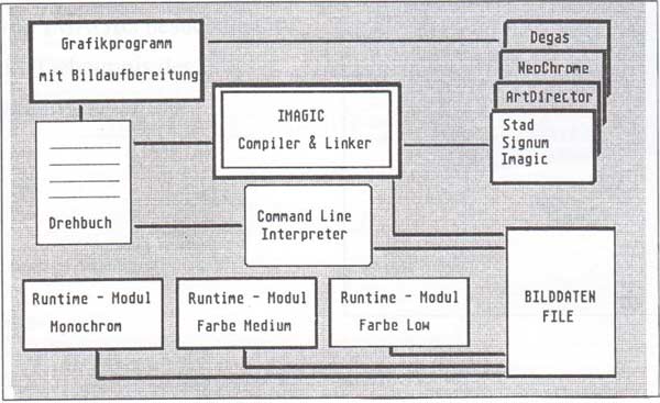 In der Anleitung heißt es: “Das Programmpaket IMAGIC ist ein grenzenloses Werkzeug für die Arbeit mit Grafiken. Es stellt Funktionen bereit für das Erstellen. Bearbeiten, Verknüpfen und Präsentieren von Bildern." Dieses Programmpaket läßt sich besser in fünf verschiedene Werkzeuge unterteilen, die wir im folgenden beschreiben wollen. Zunächst sollte aber noch ein wenig auf das Konzept eingegangen werden. Wie oben schon erwähnt, ist Ziel des Arbeitens das Erstellen einer Show von Grafiken, die mit Effekten versehen worden ist. Da Effekte von Veränderungen ihrer Parameter leben, lag es für die Autoren nahe, eine Sprache zu entwickeln, die erstens leicht erlernbar -daher mußte es zwangsläufig ähnlich einer Hochsprache wie zum Beispiel PASCAL werden - und zweitens, für das Erstellen einer Show, möglichst vielfältig ist. Diese PASCAL-ähnliche Sprache wird nun dazu verwendet, anhand der gegebenen Bilder eine ansprechende Show zu erstellen. Programmiert wird, wie man es bei anderen Compilersprachen gewöhnt ist, in einem Editor, worauf der Sourcecode später von einem Compiler in einen Code umgesetzt wird. Der IMAGIC-Compiler erzeugt aus dem IMAGINE-Quellkode (IMAGINE ist der Name der Sprache ) einen Kode, der von einem RUN-TIME-Modul verarbeitet werden kann (Bild 1). Dadurch können die kompilierten Shows durch Weitergabe der Show und dieses Moduls ohne das eigentliche Programmpaket laufen- die Weitergabe des RUN-TIME-Moduls ist natürlich erlaubt. Vielfach ist es aber der Fall, daß eine Person gerne eine Show erstellen möchte, aber bisher noch nie programmiert hat. Dem Manne (der Frau) kann geholfen werden, denn im Paket ist auch ein Programmgenerator integriert, mit dem man auf grafische Weise Shows erstellen kann, die dann als IMAGINE-Quellkode abgespeichert werden können. Da dies etwas viel auf einmal war, wollen wir die einzelnen Werkzeuge etwas genauer unter die Lupe nehmen.