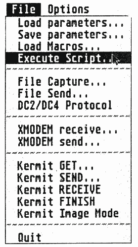 Ähnlich wie andere DFÜ-Programme bietet ANSITERM die Möglichkeit, die Funktionstasten doppelt zu belegen und sogenannte Skriptdateien auszuführen. Diese Definitionen müssen allerdings mit einem externen Editor erstellt und in speziellen Dateien abgelegt werden, da ANSI-TERM wie bereits erwähnt über keinen eingebauten Editor verfügt. Mit Hilfe der Skriptdateien kann man zum Beispiel automatische Einlogprozeduren schreiben, oder sogar einen ganzen Hostzugriff automatisieren. ANSITERM kennt zu diesem Zweck 25 verschiedene Kommandos, mit deren Hilfe man alles erledigen kann, vom kompletten Filetransfer bis zum Weckton für den User, der sich während einer halbstündigen Übertragung süßen Träumen hingibt.