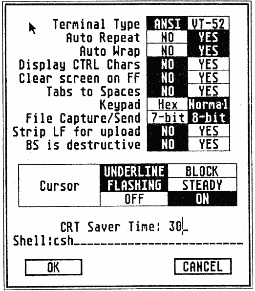 ANSITERM ist, wie der Name schon sagt, ein Emulator, der ein ANSI X3.64-Terminal emuliert, wohl besser bekannt als VT 100.