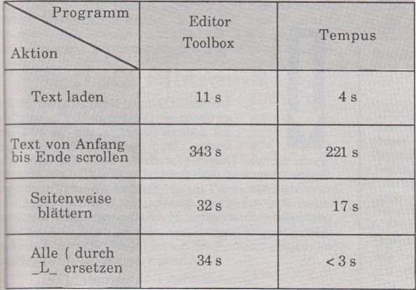 Alle Funktionen des Editors werden auf den 32 Seiten der deutschen Bedienungsanleitung ausführlich erläutert. Wer schon mit verschiedenen Texteditoren gearbeitet hat, braucht das Handbuch nur in seltenen Fällen zu Rate zu ziehen. Der Editor verwendet eine Menüleiste, von der aus alle Funktionen angesprochen werden können. Zusätzlich kann man aber auch alle Kommandos über diverse Tastenkombinationen erreichen. Dabei hat es mir sehr gut gefallen, daß in den Menüs immer die Tastenkombination, mit der eine Funktion ausgelöst werden kann, angezeigt wird (siehe Bild). Daran könnte sich Tempus ein Beispiel nehmen. Wo wir gerade bei Tempus sind: In meinen Augen ist Tempus im Augenblick der hellste Stern am Editorhimmel. Deshalb mußte er auch in diesem Test als Vergleich herhalten. Ich gehe davon aus, daß die Leser schon von Tempus gehört haben; wenn nicht: siehe ST-Computer März 1987, Seite 70, Testbericht über Tempus (Hallo Stefan). Ein wesentliches Merkmal von Tempus möchte ich an dieser Stelle noch erwähnen: die überdurchschnittliche Verarbeitungsgeschwindigkeit. Speziell in diesem Punkt habe ich die beiden Programme miteinander verglichen und zwar anhand des Quelltextes der Editor Toolbox, der stolze 5712 Zeilen lang ist. Die ermittelten Zeiten entnehmen Sie bitte der Tabelle.