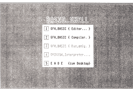 Über diese BASIC-Shell kann man auf einfache Art und Weise den GFA-Interpreter und -Compiler benutzen. Man erspart sich das lästige Suchen im Inhaltsverzeichnis und kann so auf Tastendruck das gewünschte Programm laden und starten. Natürlich funktioniert das auch mit anderen Programmen wie in unserem Beispiel das OMIKRON-BASIC.