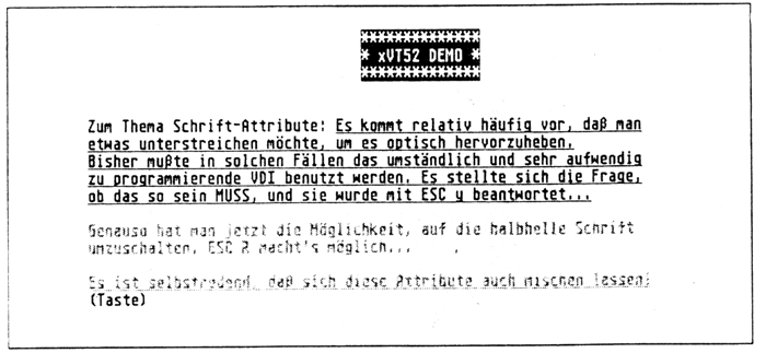 In dieser ist nun gespeichert, wieviele Bits jedes Zeichen breit ist. Somit mĂŒssen nur die Scanlines des ersten darstellbaren Zeichens auf einer Wortgrenze (gerade Adresse) beginnen; die restlichen Daten können ĂŒber die Offset-Tabelle gefunden werden, was jedoch recht zeitaufwendig und rechenintensiv ist. FĂŒr den VT52-Emulator wie auch fĂŒr die VDI-Escapes ist das aber alles vollkommen wurscht: sie erwarten, daĂ jedes Zeichen exakt ein Byte breit ist und damit basta! Ich habe die Existenz der Offset-Tabelle lediglich der VollstĂ€ndigkeit halber erwĂ€hnt; sie ist, wie gesagt, fĂŒr den Teil der Textausgabe, um den es hier geht, nicht relevant. Was ich Ihnen nun lang und breit erklĂ€rt habe, ist die in Prosa gefaĂte Prozedur PUT, die Sie am Anfang des Listings wiederfinden können. Abgesehen davon, daĂ sie ein Zeichen auf den Bildschirm bringt, sorgt sie auch dafĂŒr, daĂ - je nach eingestellten Attributen - das Zeichen unterstrichen, halbhell (disabled) oder invertiert dargestellt wird, wobei diese Attribute auch kombiniert werden können. Wie man diese Attribute wĂ€hlen kann, erfahren Sie im folgenden Kapitel.