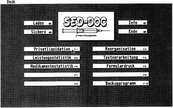 Zunächst muß vom Desktop ein Startprogramm gestartet werden, das zum Aufruf der Programmodule von SED-DOC (Schnelle Elektronische Datenverarbeitung für DOCtoren) dient. Dieses Startprogramm kann auch als automatisch startend installiert werden (Rechner einschalten und los geht’s...).