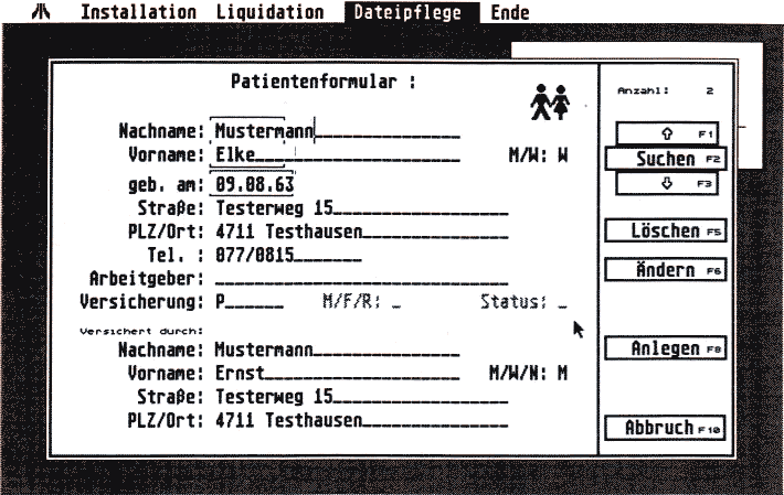 Bei den Formularen fällt auf, daß einige Einträge vom Programm noch nicht benutzt werden. So kann z. B. der Arbeitgeber eines Patienten zur Zeit schon mit eingegeben werden, er wird im Programm jedoch noch nicht benötigt. Für die zukünftigen Erweiterungsprogramme wie Rezeptdruck, Kassenabrechnung, universelles Textprogramm für Formulardruck etc. ist jedoch durch diese zusätzlichen Einträge sichergestellt, daß alle eingegebenen Daten übemehmbar sind. Die Daten werden nach Angaben der Entwicklungsfirma von diesen zukünftigen Programmen direkt benutzt.