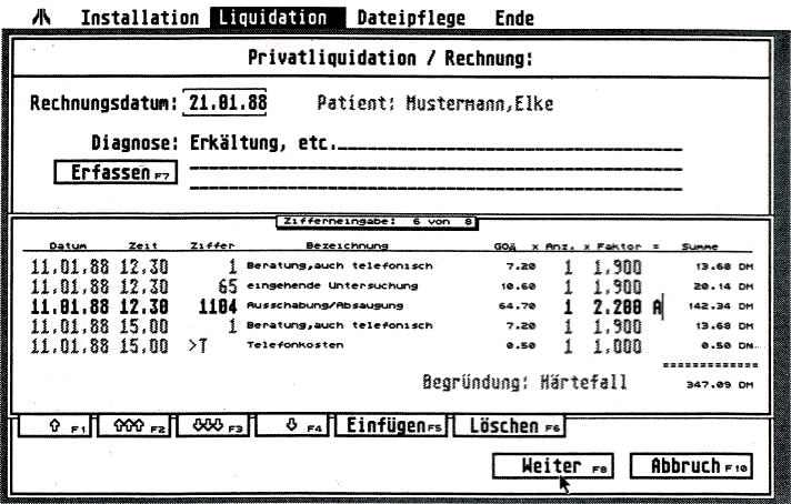 Von diesem Startprogramm aus wird nun die Leistungsstatistik mit der Maus oder durch eine Funktionstaste aufgerufen. Nachdem man dies getan hat, landet man in der Privatliquidation, die auch ohne das Startprogramm ausgeführt werden kann. Hier wird zunächst überprüft, ob alle Daten einwandfrei sind (dazu später). Außerdem verlangt das Programm eine Bestätigung des Datums, das für die Verwaltung der Patienten, Rechnungen etc. wichtig ist. Angenehm fällt schon hier auf, das man sich nicht I um einenKopierschutz kümmern muß, denn der Kopierschutz dieses Programms ist der festinstallierte Name des Arztes. Um diesen ändern zu können, benötigt man eine Kennzahl, die bei Bedarf telefonisch von der Firma mitgeteilt wird.