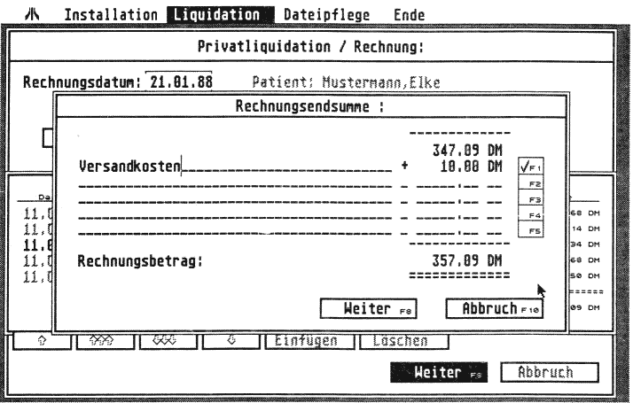 Angenehm fällt auf, daß alle Formulare eine einheitliche Gestaltung aufweisen. Man findet sich schnell zurecht. Positiv anzumerken ist auch die Möglichkeit, in jedem Formular mit "Help’ eine Hilfe holen oder mit ‘Undo’ falsche Eingaben rückgängig machen zu können. Hat man alle Behandlungsmaßnahmen eingetragen, wobei man in der Rechnung beliebig hin und herfahren und ändern kann, so erscheint ein neues Formular, in dem man noch zusätzliche Kosten oder auch Rabatte in DM oder Prozent eingeben kann.