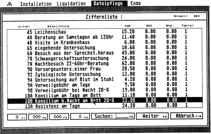 Die Dateien des Programmes, die für die Rechnungsschreibung verwandt wurden, können außer während des Rechnungschreibens auch über eigene Menüeinträge modifiziert werden. Das Programm unterscheidet Patienten, Versicherungen, Ziffern, Diagnosen und Mahnungen. Diese kann man sich jeweils als Listen ausdrucken :der anzeigen lassen. Außerdem können alle Einträge individuell ergänzt, ediert oder gelöscht werden.