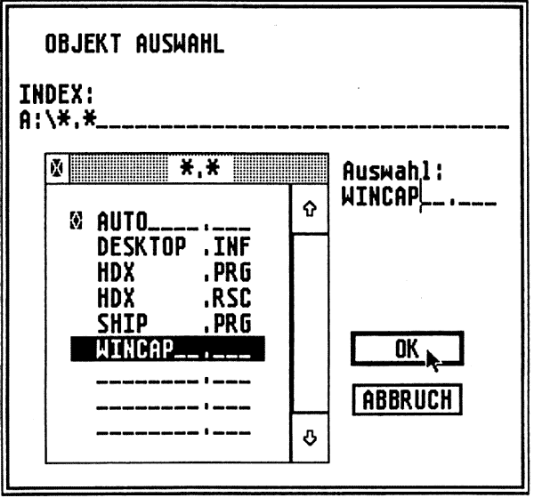 Im HDX.RSC wird zwar der Maskenaufbau bereitgestellt, doch die Texte für die Auswahl der verschiedenen Versionen werden nicht hier sondern im WINCAP eingetragen. Dadurch kann man jetzt auch so herrliche und unnütze Spielchen, wie sie im nebenstehenden Bild zu sehen sind, treiben. Sehen Sie sich im Ausschnitt des WINCAP die Modifizierung an und vergleichen Sie damit das Resultat im Programmablauf. Sie können hier bis zu 16 verschiedene Einträge vornehmen. Ich habe mir damit ein WINCAP geschrieben, in dem an dieser Stelle die verschiedenen Laufwerkstypen mit unterschiedlichen Formatangaben eingetragen sind. Das Beispiel hat aber noch keine Auswirkung auf die Formate selbst, dazu müssen noch weitere Parameter eingetragen werden.