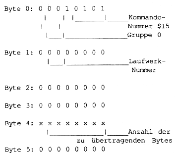 In Byte 4 wird die Anzahl der im Anschluß an die Command-Phase übertragenen Bytes bekanntgegeben. Es müssen mindestens 12 Bytes sein; es können aber auch bis zu 22 Bytes bei softsektorierten und 24 Bytes bei hardsektorierten Laufwerken werden. Diese ersten 12 Bytes beinhalten die MODE-SELECT-PARAMETER-LIST und die EXTENT-DESCRIPTOR-LIST. DieParameter-Liste umfaßt vier Bytes mit den Werten 0, 0, 0 und 8 und gibt nur Auskunft über die Länge der nachfolgenden EXTENT-DESCRIPTOR-LIST. Das hört sich natürlich total unsinnig an, aber damit sollte eine spätere Erweiterung möglich sein.
