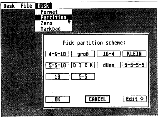 Nach der Erklärung finden Sie am Schluß der WINCAP-Datei bereits eine Auswahlliste für verschiedene Aufteilungen Ihrer Festplatte. Hier muß auf jeden Fall der Eintrag vorhanden sein, der über den Default-Wert von pt=name angesprochen wird. Andere Einteilungen können Sie auch in der Menüwahl des HDX.PRG über das Fenster “Menu ' von Hand frei bestimmen. Da zu Ihrer Sicherheit vor der endgültigen Partitionierung noch einmal eine Sicherheitsabfrage erscheint, können Sie ruhig ein bißchen herumspielen; achten Sie dabei bloß auf Ihren rechten Zeigefinger, daß er keinen Murks baut - für Datenverluste jeglicher An übernehme ich keine Garantie.